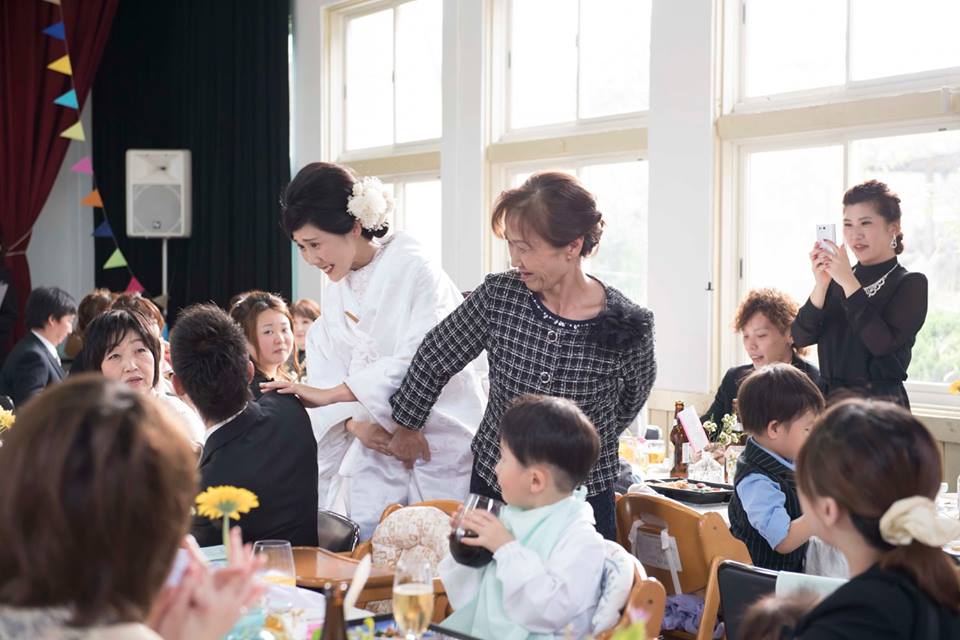 ご親族の皆様に見守られるなか挙式を行い、そのままみんなで披露宴会場をなるゆいきららへ!