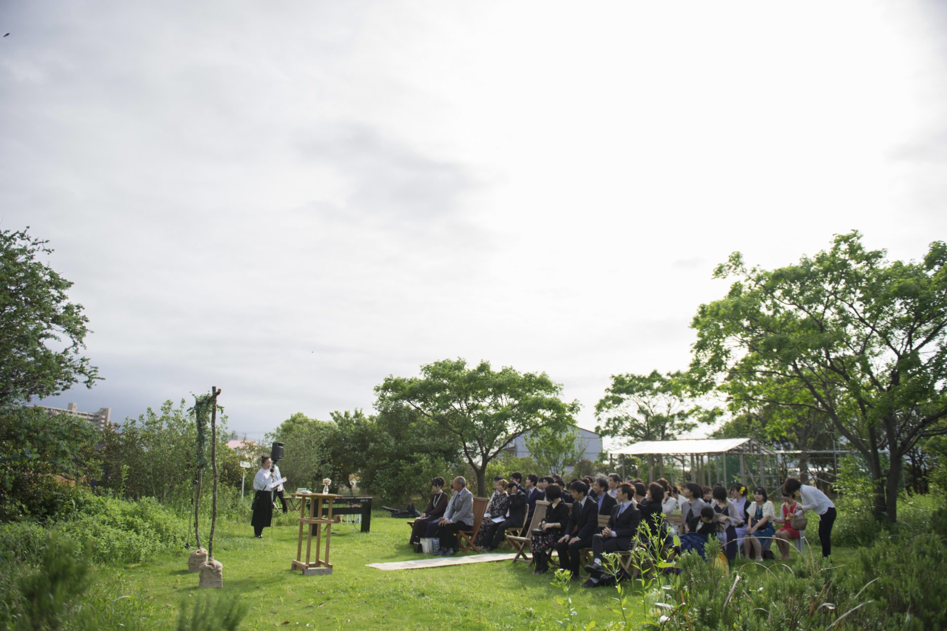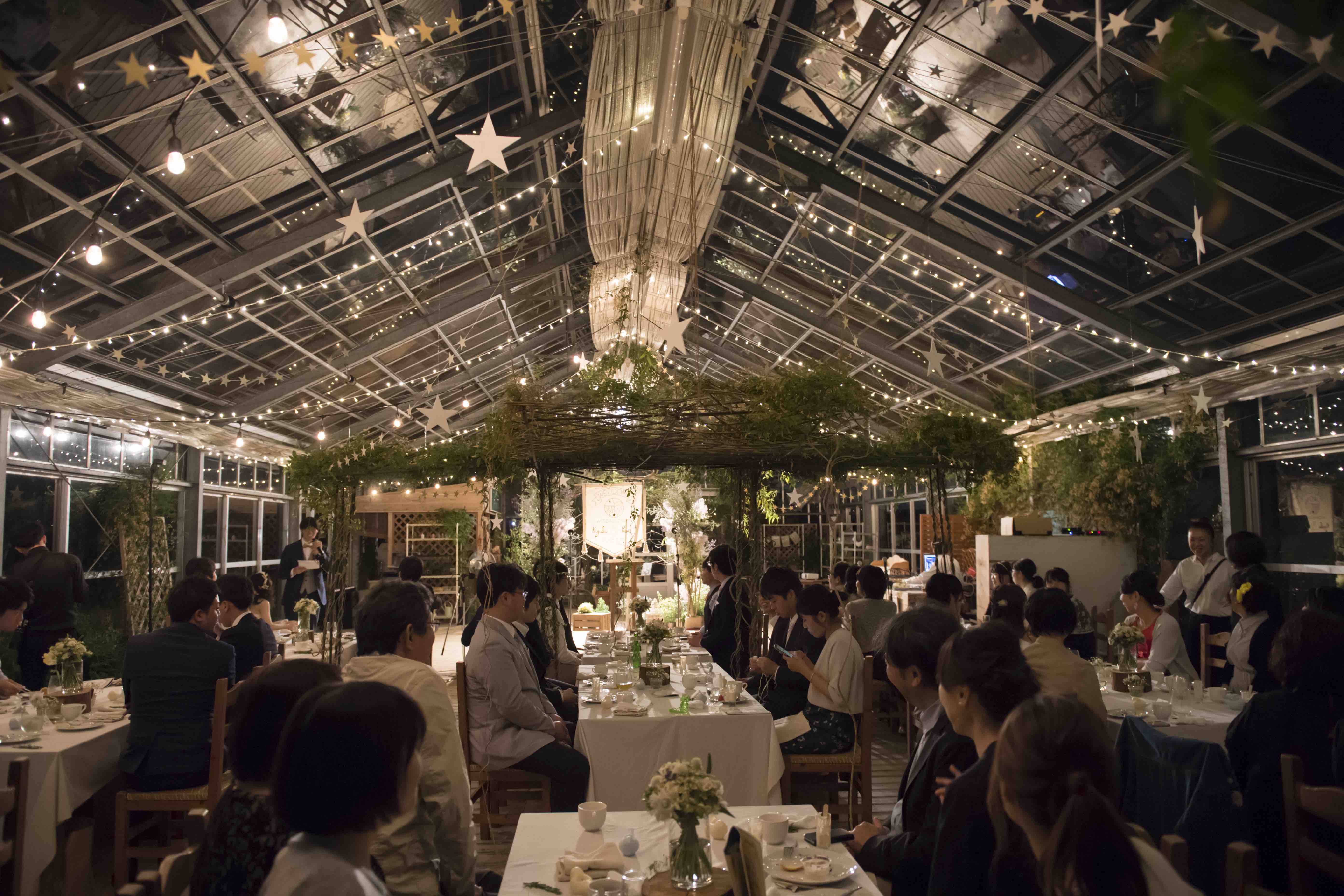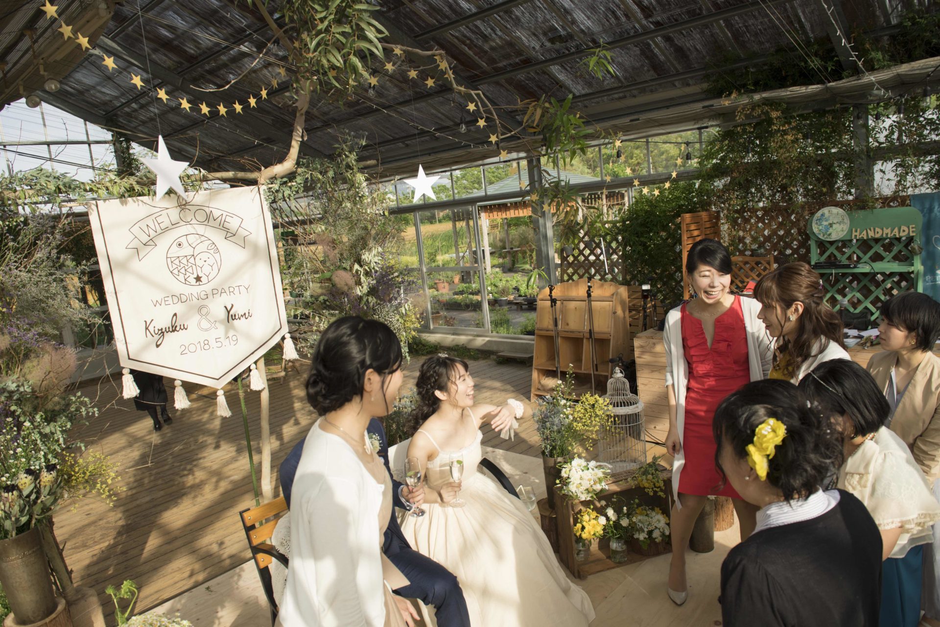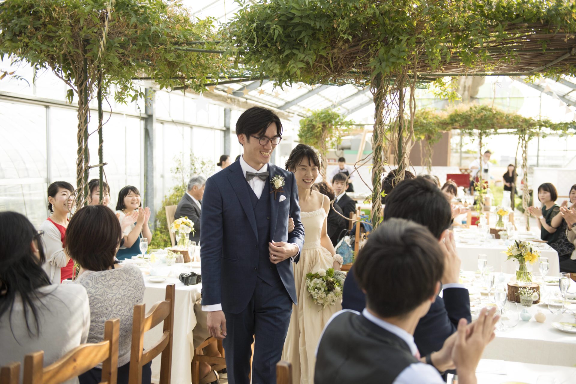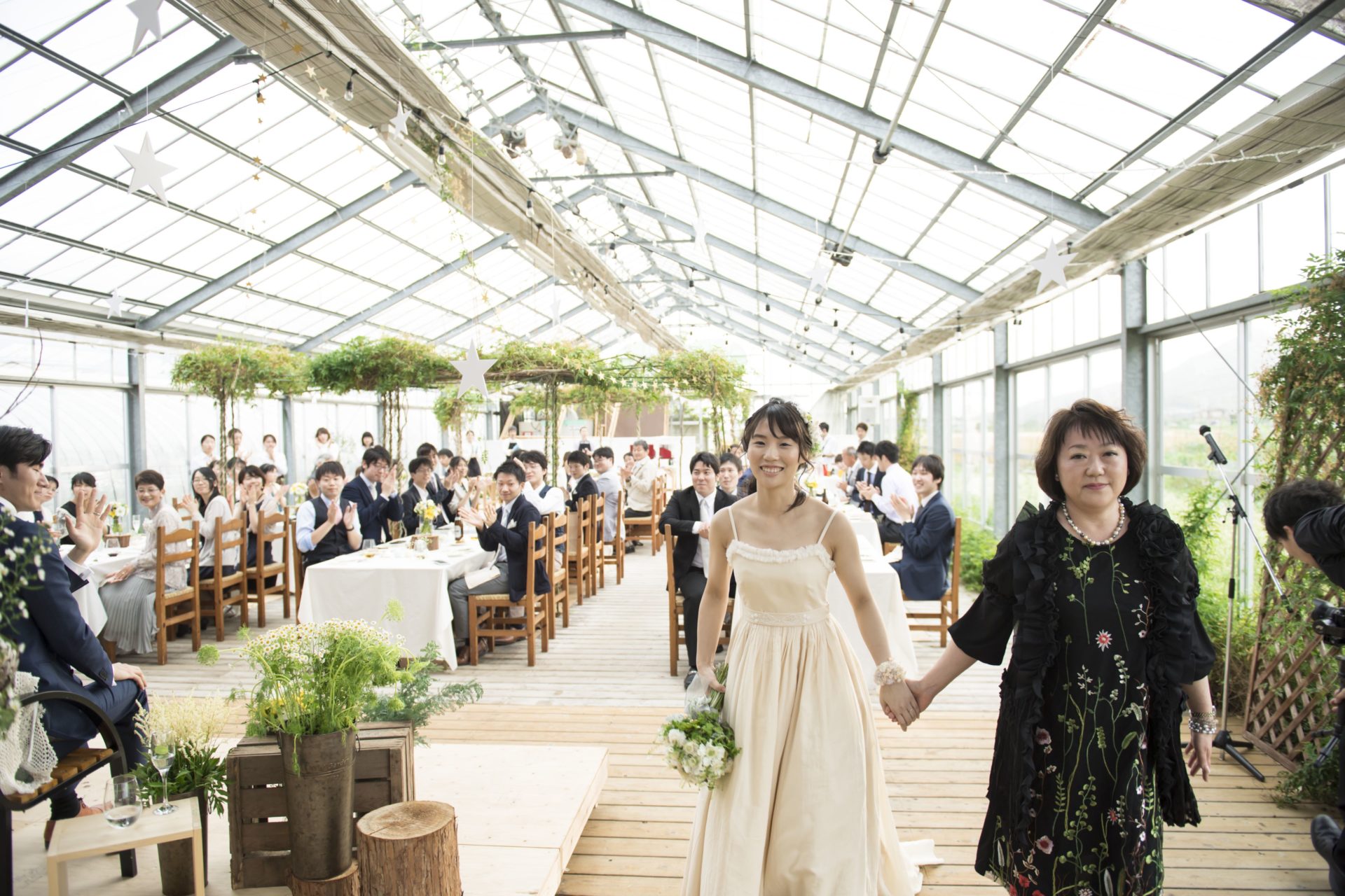 この場所でのウェディングのプロデュースは4回目ですが、毎回違った素敵な景色が広がる自然の中の会場(というか、いつもはハーブの苗が並ぶ温室)。