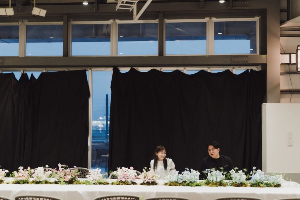 中心地の貸しホールやアウトドア会場など、さまざまな候補を一緒に見学をして、どこもそれぞれの良さはあるけど「ここだ!」と決めきれず、それでも「きっといい結婚式にできる」と信じていたギリギリのタイミングで、見つけたのが、福岡空港の一角。広々としたテナントが閉鎖していたので、もしや!と思って空港に問い合わせてみると「結婚式での使用?素敵ですね!」と、驚くほど温かく受け入れてくださいました。